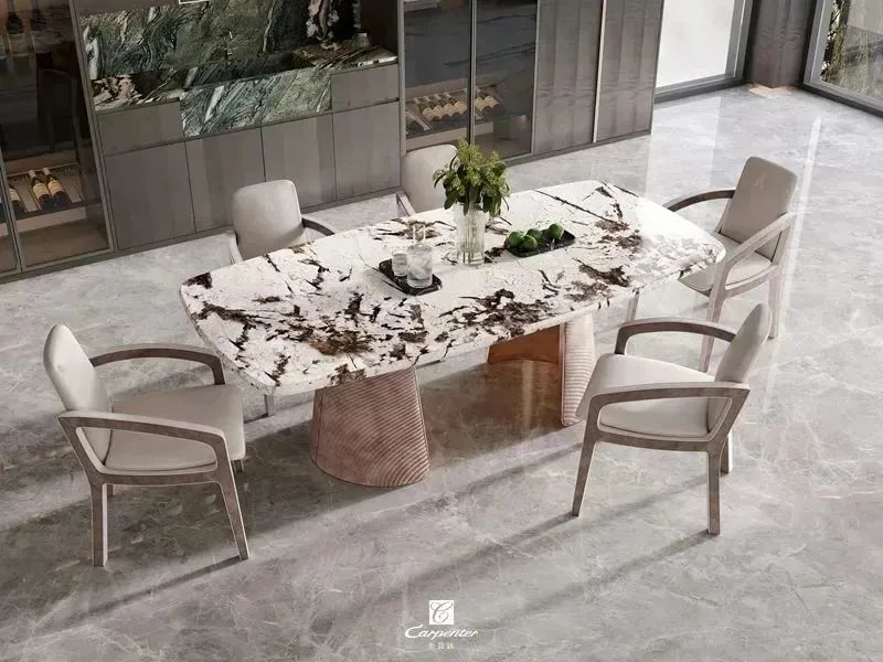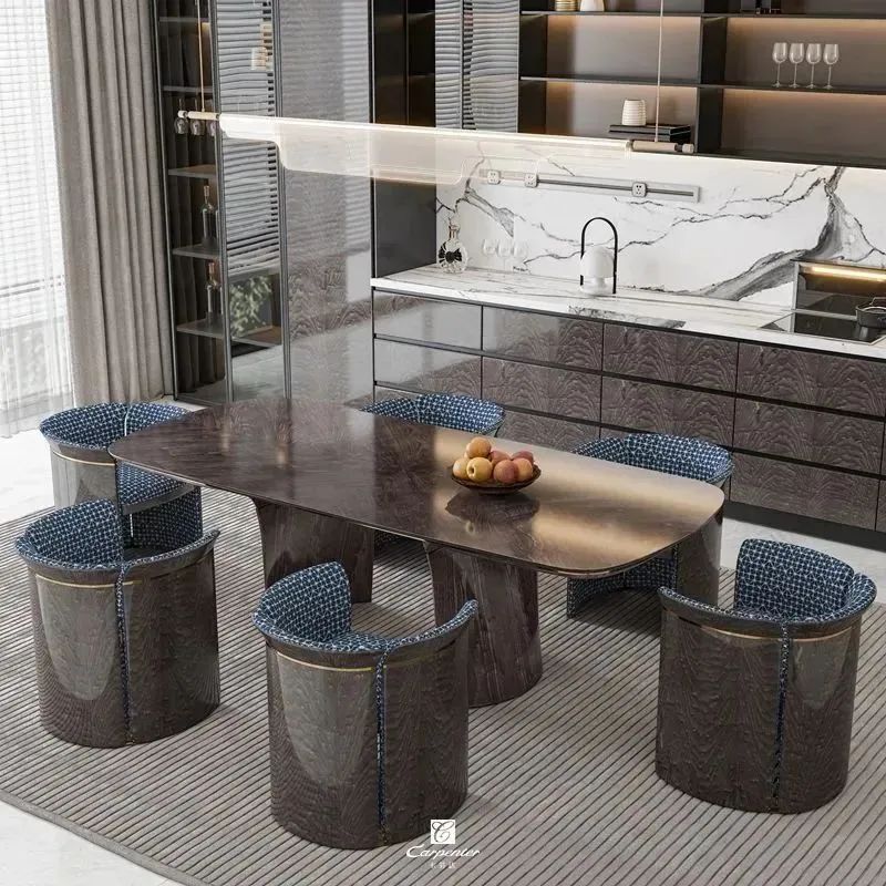 設(shè)計師通過材質(zhì)選擇、色彩運用和軟裝搭配,演繹高級輕奢風(fēng)。注重空間與功能的結(jié)合,餐邊柜、酒柜及餐桌椅井然有序、整齊劃一,滿足用餐、收納、展示等多重需求。