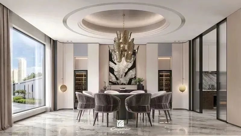 深棕色亮光的定制柜、金邊點綴的餐桌椅、間隔使用的玻璃門,細節(jié)中透露著浪漫,打造高級精致的輕奢風(fēng)餐廳,營造情調(diào)十足的用餐氛圍,用餐也自帶精英范兒。